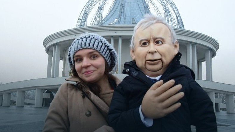 Klaudia Jachira przed toruńską siedzibą Radia Maryja z kukłą Jarosława Kaczyńskiego